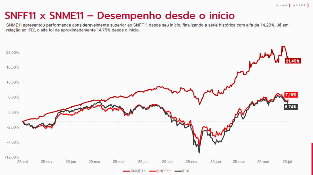 Performance positiva do SNME11 frente ao SNFF11 desde o início, com alfa de 14,29%